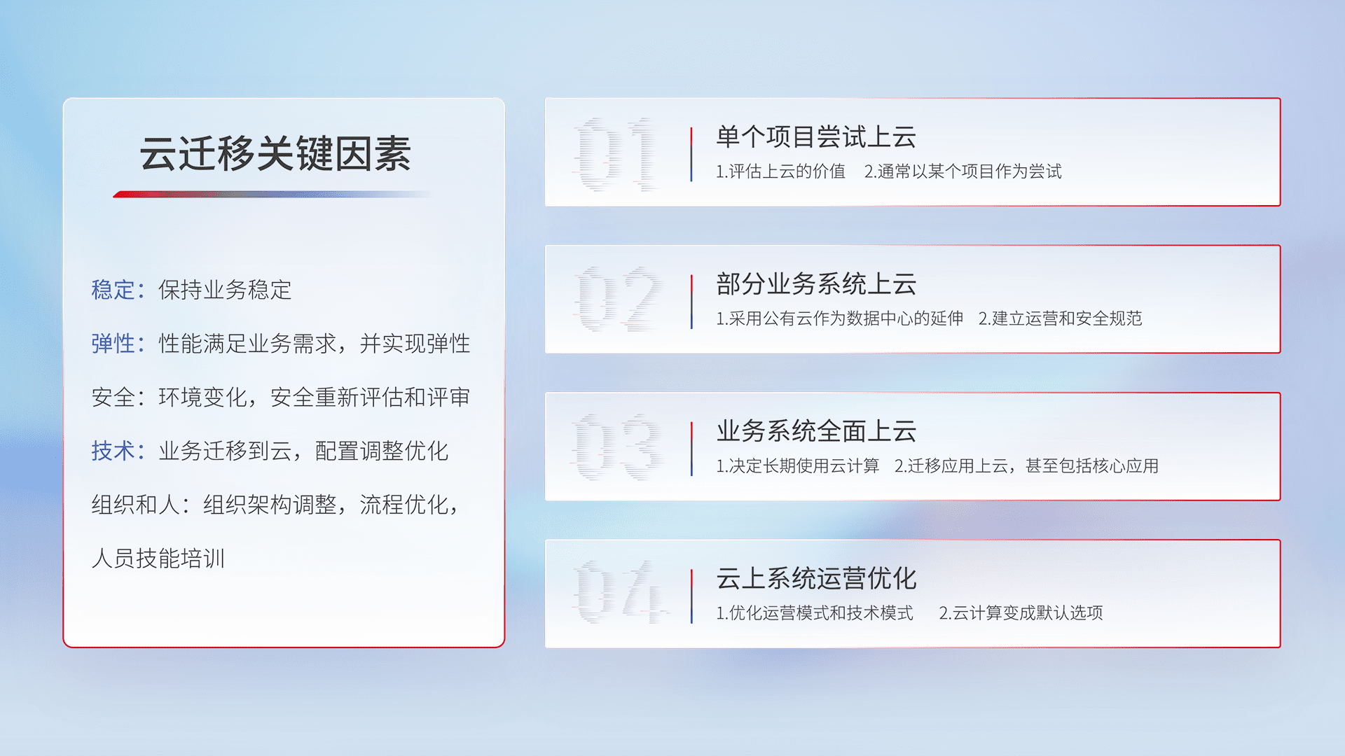 结合实际业务,,,从规划设计、、云平台选型、、云原生改造、、、、数据迁移、、、集成交付,,,,迁移全过程为客户识别最佳上云路径,,,做好风险识别管理,,,设计网络架构、、身份权限、、、安全审计合规、、操作审计、、、日志审计、、监控告警策略、、、、多站点容灾设计等,,,,对云上基础设施进行整体规划,,,提升IT治理水平,,,,以满足弹性、、、、高可用、、、高性能的需求。。