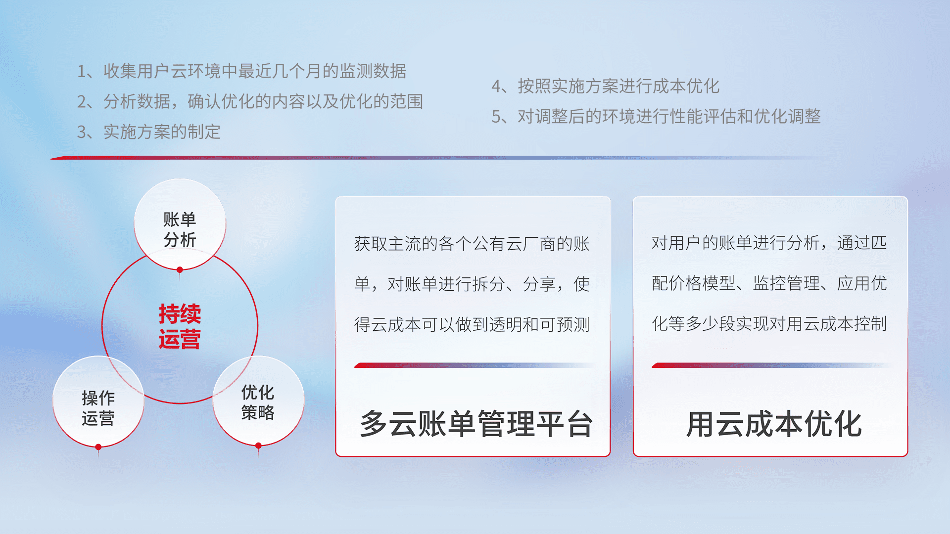 通过多云纳管,,,,以统一的资源数据模型把客户的云资源进行抽象和封装,,进而实现对多云资源的统一操作,,,,保障云资源管理的可靠性、、、、稳定性与可用性。。量身定制化运维内容,,,配置、、开发运维、、、补丁管理、、、备份、、监控、、、、认证和访问管理、、、、审计和日常巡检等,,,保障在用云过程中的可靠度,,,稳定度以及高可用率。。。